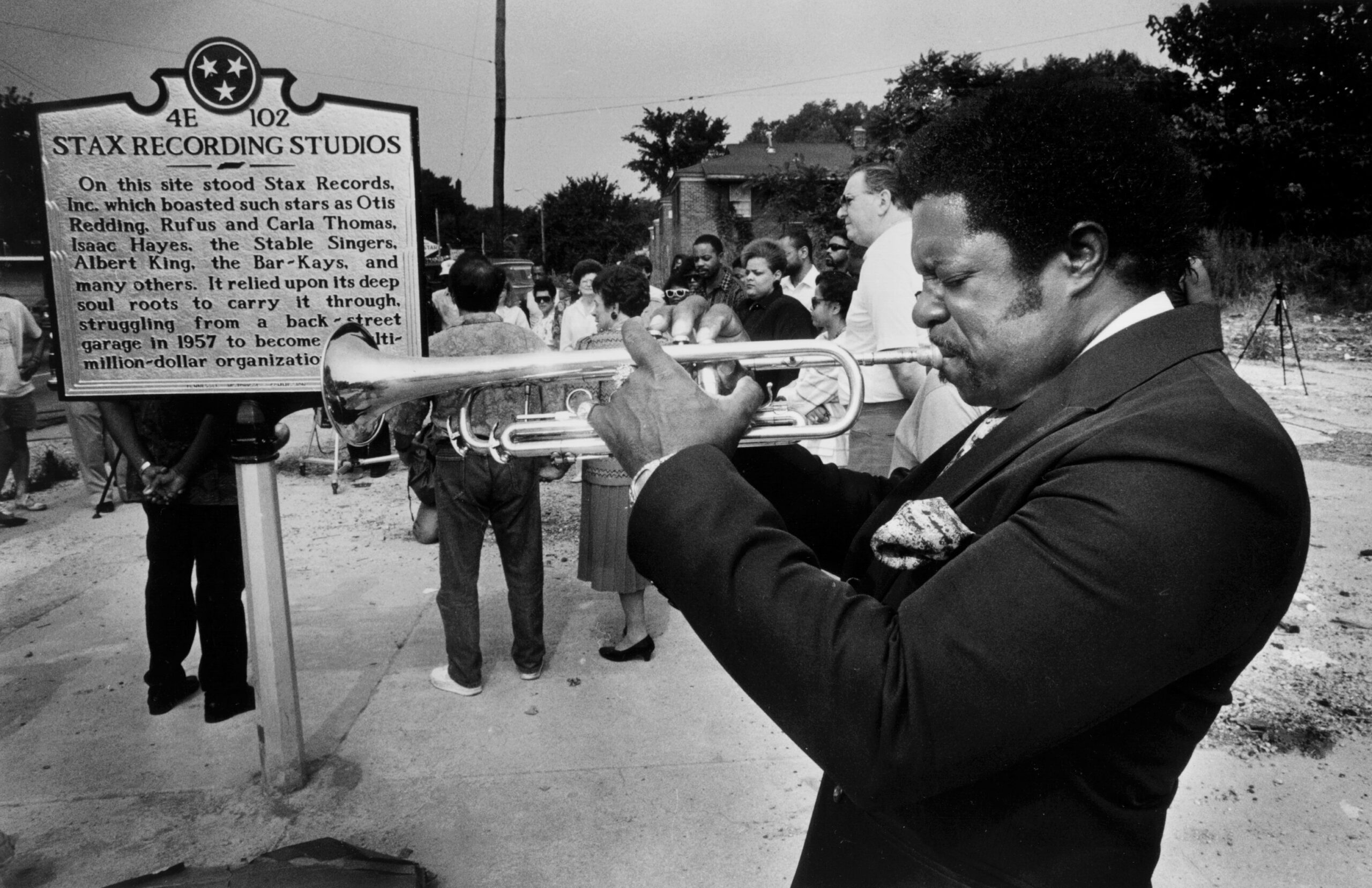 Ben Cauley,who was a member of the original Bar-Kays and survived the fatal plane crash that took the lives of other members of the group and singer Otis Redding, played his trumpet at the site of the old Stax Recording Studios at 926 McLemore at the unveiling of the historical marker shown here June 22, 1991. James Alexander, who was also a band member in 1967, was on a commercial flight rather than the plane that crashed. (Dave Darnell/The Commercial Appeal)